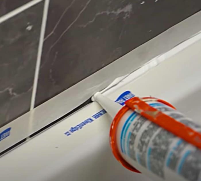 White silicone sealant being applied using a caulk gun in a bathroom shower.